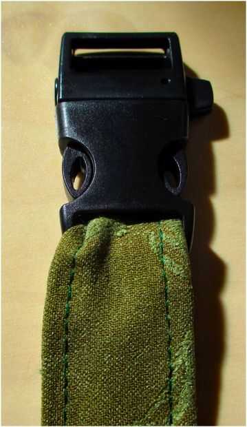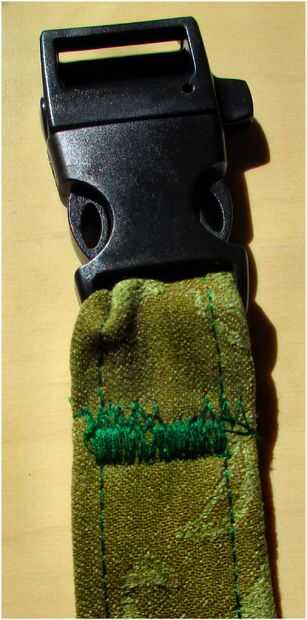 Un lado de la hebilla tiene una conexión permanente con la correa.  Pase la correa a través de este lado y coser en como se indica.