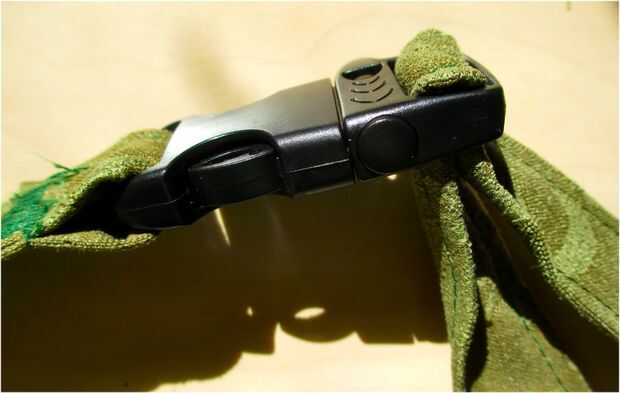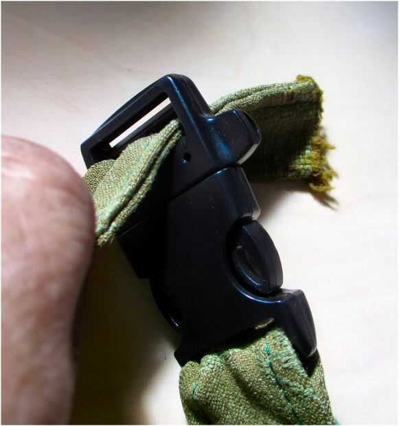 El extremo ajustable de la hebilla en la correa del hilo de rosca como se muestra.