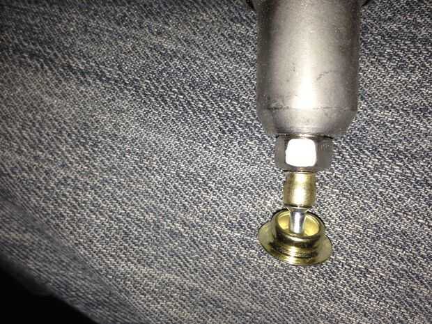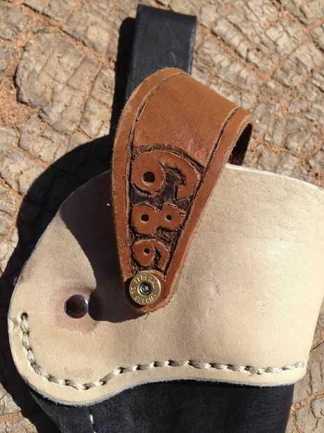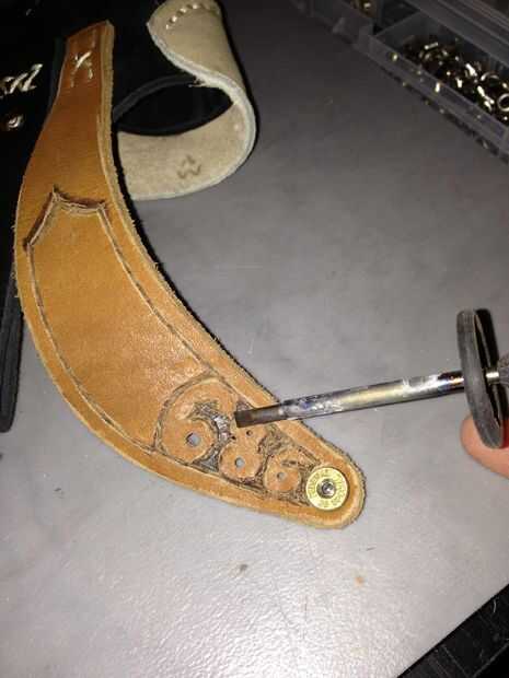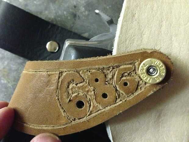 hice unos lo encargo a esta funda. Primera tallado y quemado el modelo de la pistola en la correa. Era un poco difícil debido al tipo de piel, pero salió bien. También he añadido una parte superior más claro de cuero de color. Finalmente, mi favorito, he utilizado el final de un 38 especial como el botón frontal de la carcasa. Para fijar la carcasa para el complemento con un remache de crush. Tuve que hacer un adaptador para hacer que el remache correctamente.