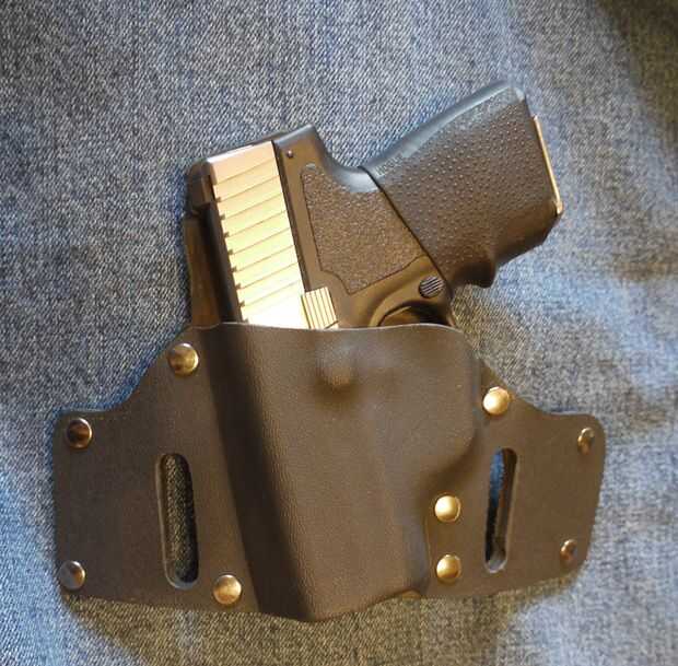 La funda en la foto es un diseño de alta-paseo panqueque que fija el artículo por encima de la línea de la correa para fácil ocultación. Puede utilizar las mismas técnicas con sólo un corte diferente para crear dentro de los diseños de la pretina (ver viejo pistoleras fiel por encima de un gran tutorial sobre cómo hacerlo). También puede levantar las alas y las ranuras de la correa para hacer una funda exterior de la cintura que no tan alto.