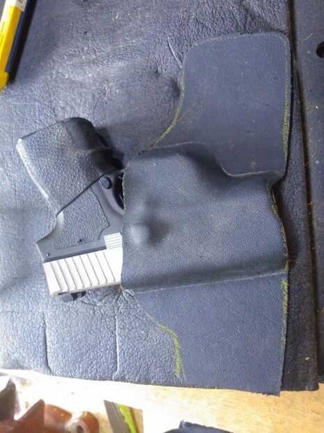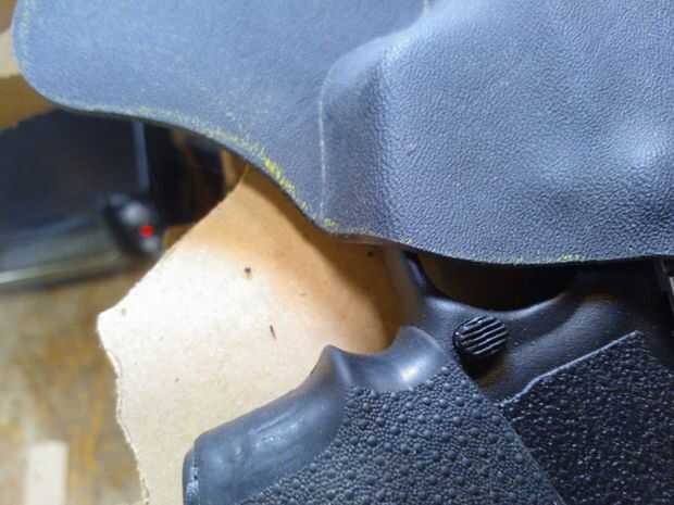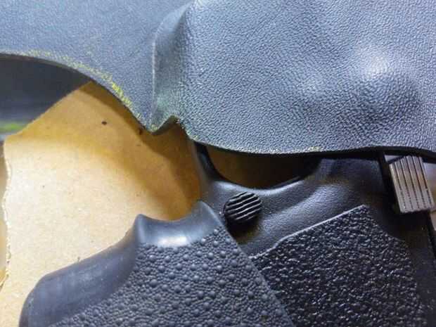 Una vez que te gusta la forma, comprobar el espacio libre entre la empuñadura y la parte superior del kydex. Si la mano toca el kydex mientras dibuja, usted cortará su mano cuando se mueve rápidamente o hacerlo mucho. Observe el mayor espacio que corto entre cuadros 4 y 5 para asegurarse de que era un montón de espacio libre. Asegúrese de que el gatillo está todavía completamente encerrado cuando la pistola esté colocada en la funda.