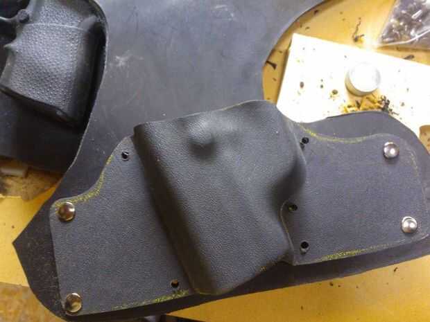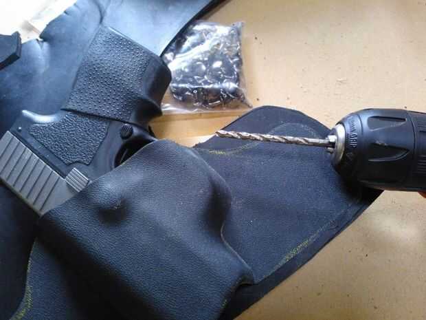 A continuación, poner dos remaches más en las otras dos esquinas exteriores de lo kydex. Una vez que son todo y el arma es apropiado darles cada otro golpe para definirlas completamente. Tenga cuidado a la herramienta de ajuste con cuidado para no dañar la cabeza del remache. La pistola va a siendo bastante flojo en este punto hasta que se fijan los remaches internos.