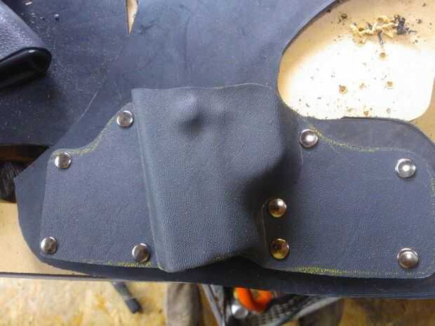Listo un remache en el extremo de la funda. Para esta parte de la operación, yo siempre asegúrese de que la pistola está en la funda porque cambia donde los orificios se alineen. Que tenga que empujar un poco para asegurarse de que las mentiras de kydex en el cuero con la pistola en la funda. Una vez que taladre el segundo agujero, deje la pistola en la funda y establezca el segundo remache con un golpe.