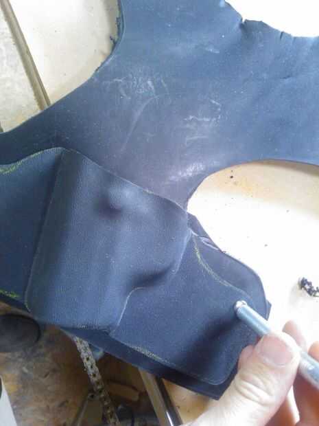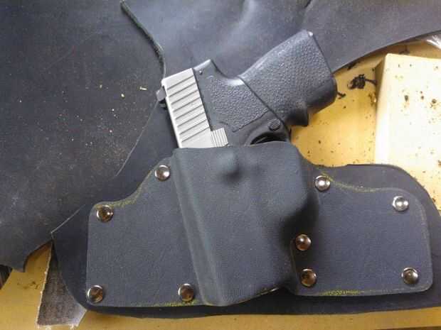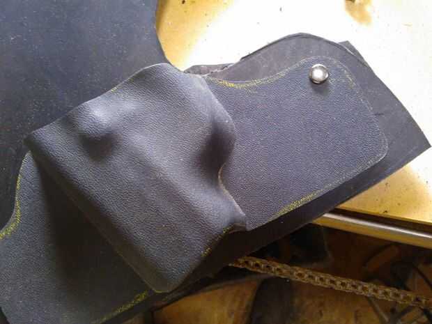 Retire ahora la pistola de la funda. Perfore los orificios interiores cuidando de llegar lo suficientemente cerca para que el cuero será permanecer firmemente, pero no tan cerca, te no puede establecer el remache plana y al ras. Asegúrese de fijar los remaches alto en las esquinas interiores cerca del guardamonte y la cámara. Otro lugar clave es justo debajo del guardamonte, donde se encuentra con el marco.