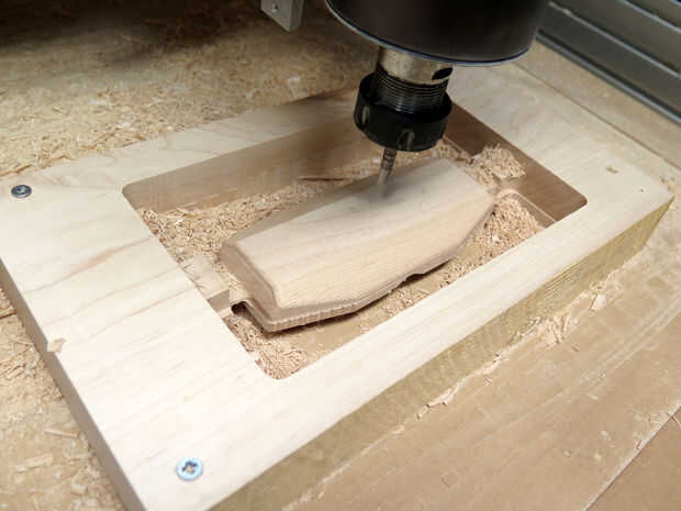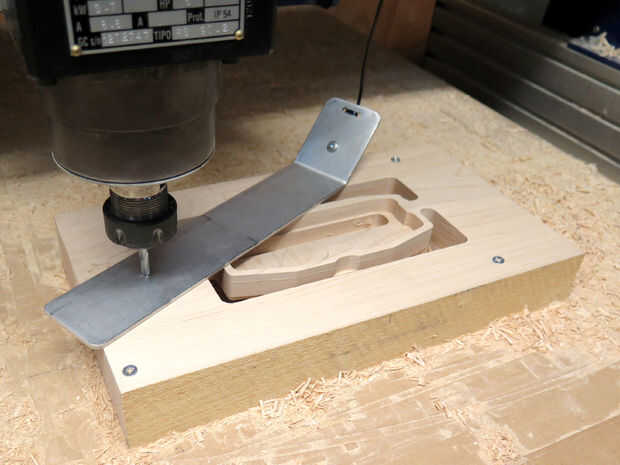 Poner las clavijas en su lugar y voltear la madera colocando los pernos sobre los 2 agujeros en la tabla de sacrificio. Necesita atornillar la pieza hasta la tabla de sacrificio porque los pines sólo alinean correctamente. Cero Z usando la placa Z y comienza la trayectoria de la parte inferior. Lo hará el desbaste y luego las trayectorias de herramienta de acabado.
