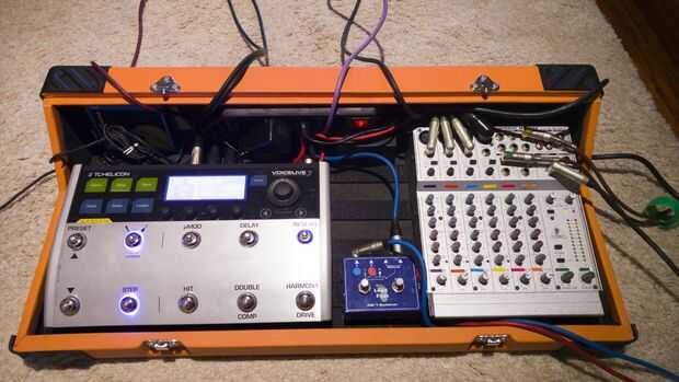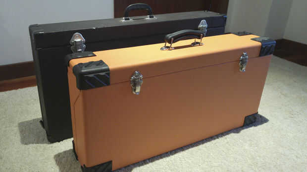 He construido este caso pedal naranja. Previamente he construido una caja marrón para todos mis pedales (uno en la espalda) y el minimixer que utilizo para la mezcla y monitorización en mi curro. Era 9 kg vacía y con todo el engranaje interior alcanzó casi 19 kg!