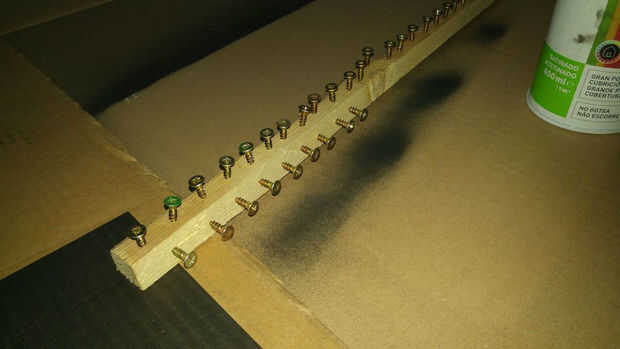 Tornillo las esquinas. Como se puede ver, mina eran negro, y me decidí a pintar de negro la parte superior de latóntornillos que me ido a utilizar con algunos pintura satinada negra. Montado en una franja de desecho de madera y les dio una sola capa de pintura.