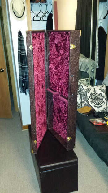 así que hice mi primera guitarra de la caja de cigarro este verano.  Es un bajo de la cadena cuatro.  Sin embargo, es difícil encontrar buenos ejemplos de un maletín de pantalla para él.  Diseñé de pino de 1 por 2 con paneles de madera contrachapada.