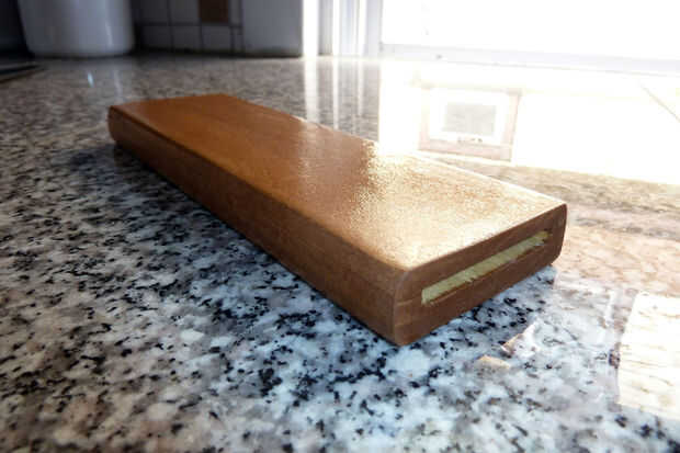 Lo darle un aspecto curvado a la funda, así la pasé por la herramienta rotativa con una broca redondeadora, pero dejé planos los bordes de la boca, donde se mete el cuchillo. A continuación, la lijé con papel de lijar de varios granos (60 > 100 > 150). Luego, le apliqué un acabado acuoso y un esmalte en forma de aerosol). No manché el interior, ya no se verá y en cualquier caso no lo el cuchillo se pusiera en contacto con un acabado.