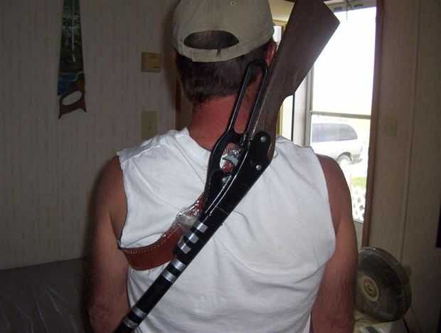 Para sacar, no deslice hacia fuera como si fuera una espada, esto puede rayar la pistola y toma más tiempo y espacio para hacer. La forma correcta es poner su mano sobre la empuñadura, y doblar sobre su hombro, algo así como si está acarreando un saco o ' taters.