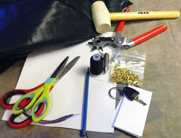 cuero papel y pluma/lápiz (para la fabricación de patrón) cuchillo de tijera o arte ojal/ojal y ajuste de herramientas ponche de cuero almohadilla de corte auto-sanación máquina de coser e hilo - o dedal y el hilo para coser a mano