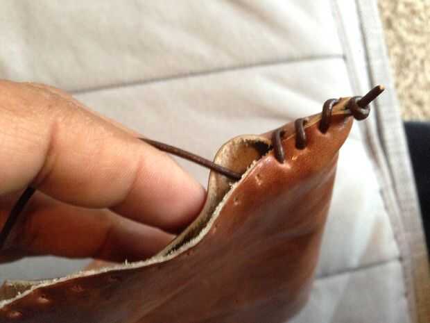 Primero tienes que hacer un nudo en el extremo del cordón de cuero. Ahora en el otro lado de la pieza de encaje, corte en ángulo para facilitar su pasan por los agujeros. Puede que necesite seguir cortando porque al final obtendrá «suave» y no ser tan fácil ir a través de los agujeros. Coser el cordón mantiene bastante apretado, que usted quiere asegurarse de que las dos piezas de cuero no tienen un espacio, pero no vuelta demasiado. Al llegar al final, ate otro nudo o dos y cortado el cordón de cuero a la medida (no demasiado porque el nudo puede aflojarse).