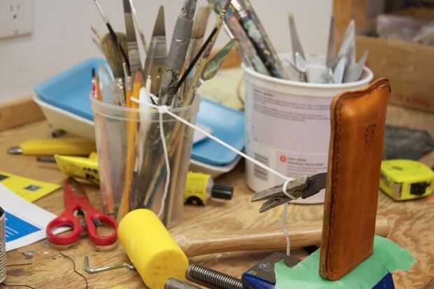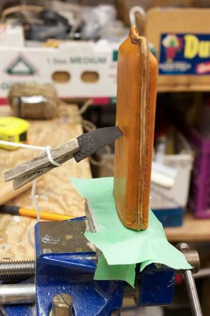 Una vez más con un dauber lana, apliqué un acabado, usando la misma técnica que al aplicar el tinte. Opté por usar Tan Kote, una menos brillante acabado, pero estoy seguro de que usted podría sustituir otro final si usted prefiere. Arriba, puede ver el artilugio autoexplicativa pinza para la ropa que usé para asegurarse de que la lengüeta no ponerte ni obstaculizar la aplicación del acabado.