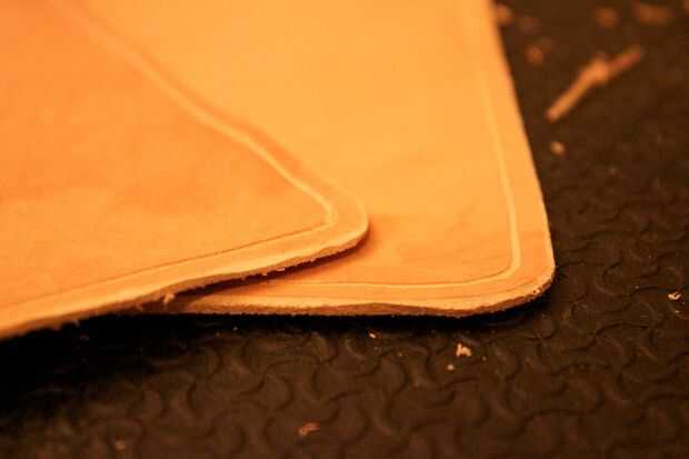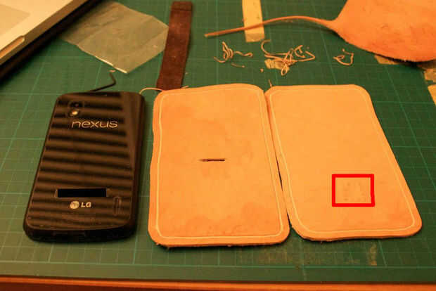 Este es el punto donde recomendaría usted hacer cualquier estampado o los accesorios. En mi caso, yo he personalizado el caso, por debajo de donde la lengüeta se sutura a la parte delantera (no fotografiada). Si usted piensa en estampado, use una esponja para humedecer ligeramente el cuero antes de mano y los resultados serán mucho más definidos.