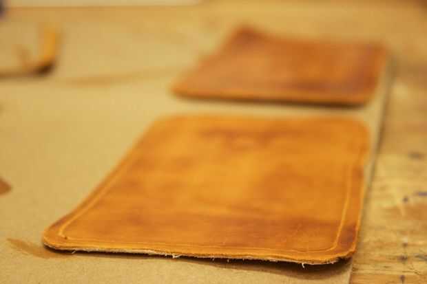 Ver su video (desglosado en secciones en el abajo descripción) muy amable. En vez de 34:10 marca, cubiertas de cuero teñido con un dauber lana. Explica la mejor manera de aplicarlo (porque el cuero tiene un grano) es comenzar aplicando en círculos, y luego terminar con una segunda capa en líneas rectas.