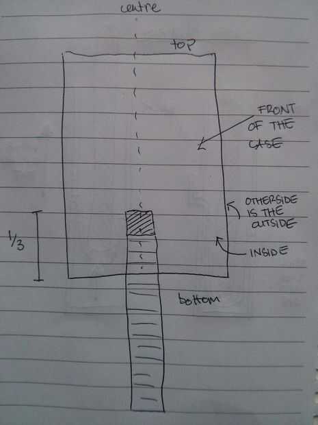 Ante todo, centrarse en fijar la lengüeta en la parte delantera (lado sin la raja) de su caso. Usted debe colocar aproximadamente 1/3 de la vía, desde el fondo de su caso y centrado horizontalmente desde cualquier lado.