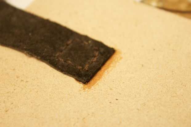 A continuación, se preparan para reforzar ambas áreas pegadas (extremo suelto del lengüeta y recién adjunto extremo) con costura. Para ello, colocar la pieza delantera con la pestaña adjunta en una estera de goma (u otra superficie protectora de la superficie, como un trozo de cuero sobre una tabla para cortar polietileno) y utilizar su mazo de golpe y goma de diamante para crear agujeros para sus puntadas.