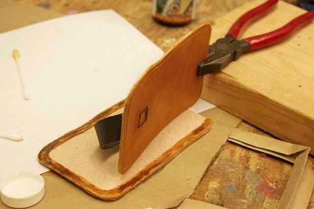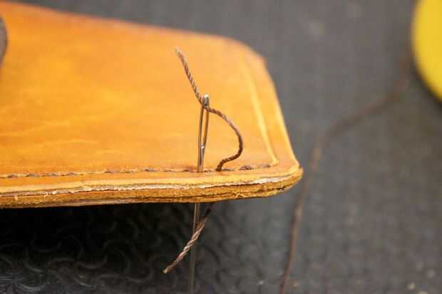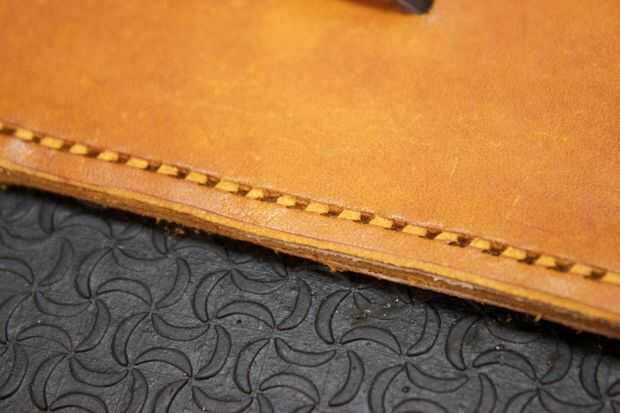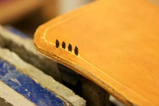 A continuación, se preparan para reforzar su pegado parece con la costura. Hacerlo, su caso una vez más en una estera de goma (u otra superficie protectora de la superficie, como un pedazo de cuero grueso en una tabla de cortar de polietileno) y utilizar su mazo de golpe y goma de diamante para crear agujeros para sus puntadas.