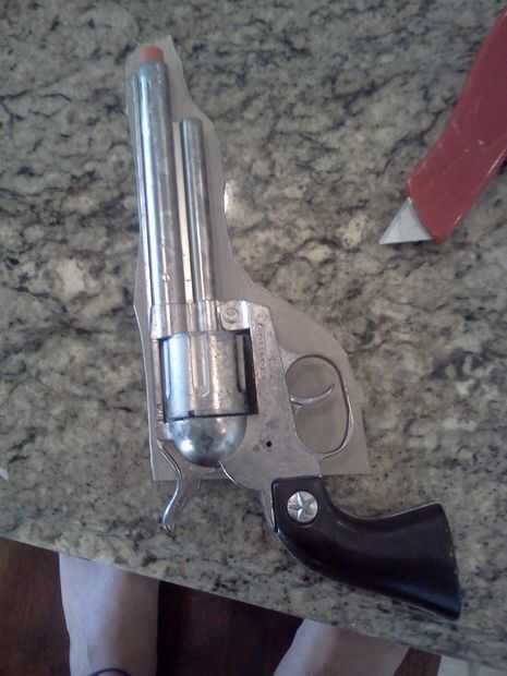 Hacer un oultline sobre el cartón pesado de la pistola y hacerlo por lo que es un poco más grande que el arma lo es más fácil poner en el. Trazar el mango. Después de hacer este corte que puede ver que funciona con el cartón.