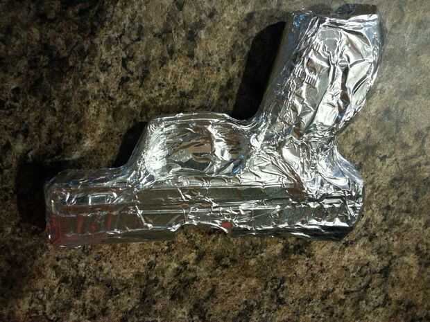 Empecé haciendo hervir la olla de agua. Mientras espera para que hervir el agua envuelve la pistola en papel de aluminio, como instamorph tiene la mala costumbre de pegarse a otros plásticos no quiso tomar la posibilidad de que se pegue al bastidor.