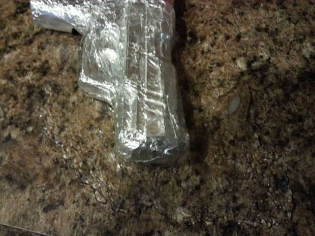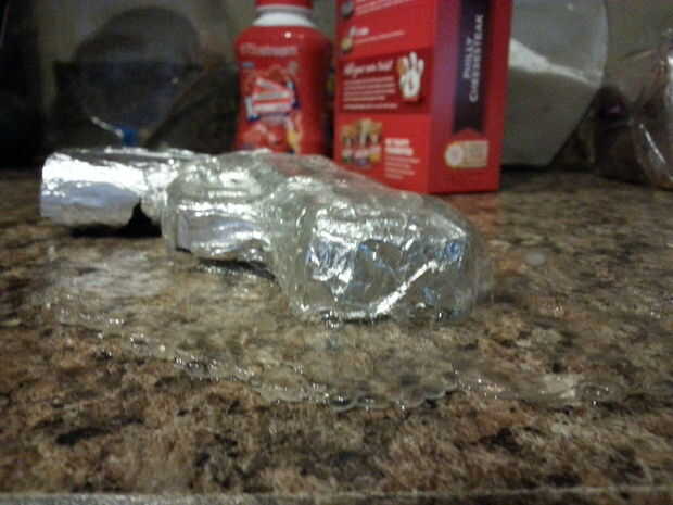 Una vez que el agua esté hirviendo Vierta el instamorph en la olla. Después de la Instamorph se convierte claro cuidadosamente retire utilizando un utensilio de metal. Estará muy caliente. Rodillo en una hoja plana y pone en el agua para recalentar cuidadosamente. Después de unos minutos más retirar el agua hirviendo y colocar por encima la pistola envuelta de aluminio. Ayudar a formar alrededor del arma, pero no demasiado o los bordes que sobresalgan evitará que el arma se remueven en todo una vez que el respaldo ha sido añadido. Una vez que ha sido moldeada por el arma comenzará a girar a la blanco mientras que se refresca. puede acelerar esto a lo largo poniendo en el refrigerador o congelador. Recomiendo quitar el arma de fuego antes de colocar cualquiera de esas áreas para evitar la acumulación de humedad.