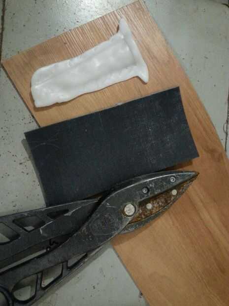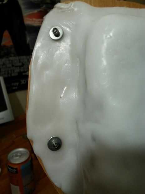 Cortar un trozo de la goma vinilicos con el respaldo del tamaño necesitan. Alinee el molde de instamorph en el pedazo de vinilo y pinza si es necesario. Perfore agujeros lo suficientemente grandes como para acomodar los remaches. Una vez que los agujeros han sido perforado Inserte el remache y la arandela, seguro repita proceso por todos los agujeros de remache. Ahora que se ha colocado el molde de imstamorph a la base otra vez prueba de ajuste. Si ahora hay problemas, puede fijarse con una pistola de calor. Ahora que ha sido verificado para el ajuste que se puede cortar a la forma final.