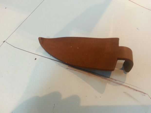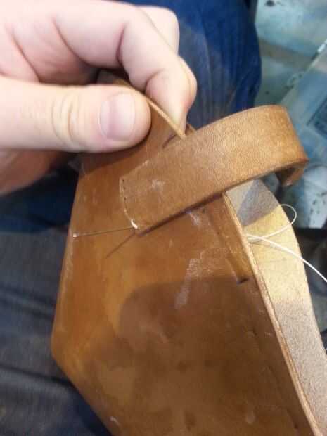 entonces sujeta el cuero donde sería ser cosido para conseguir la forma vaga de la funda.