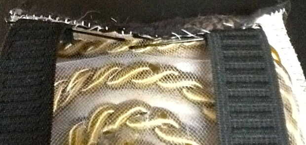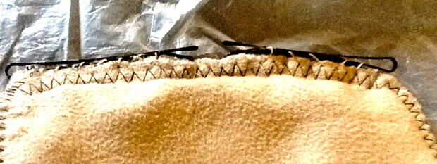 (Foto 1) Con el hilo resistente, coser dos horquillas en cada borde de la colcha (estos son los bordes de la sección amplia que va encima de la almohadilla de ventilación - Recuerde, queremos que esa sección sobre el teclado mover de un tirón hacia abajo de las teclas) con los extremos abiertos de las horquillas uno frente al otro. Les de la tachuela en su lugar con unos pequeños toques de cemento de tela.