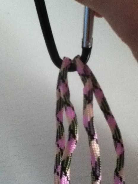 Las dos piezas por el mosquetón del hilo de rosca. Dos los en la parte delantera será el medio más y los dos en la parte posterior se anuda para hacer el patrón zigzagueantes.