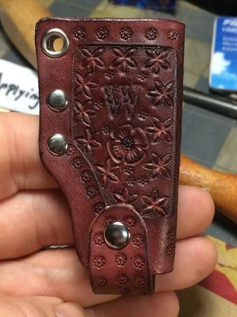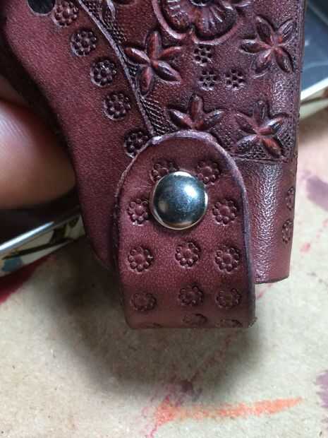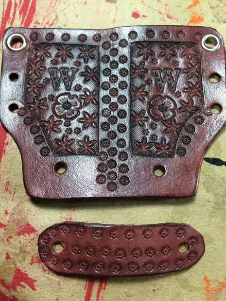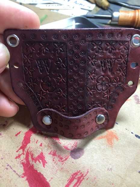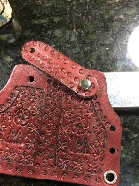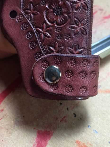 Ahora el tapón. Coloque la funda plano con el diseño hacia arriba y poner un remache base en cada agujero hecho por el tapón. Coloque el tapón de eso y establecer un remache (nota no ponerlo 100% ajustado necesita ajuste sala siguiente) entonces establece el otro lado del mismo modo. Doblar la funda en su posición correcta y tire el tapón alrededor en su posición correcta. Ahora puedes ver por qué no quieres tornillo apretado. Puede establecerlos más estrictos si necesita ahora.