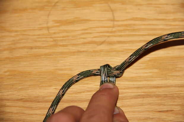 2. hacer otro ciclo con la derecha más longitud de paracord asegurándose de que envuelve el paracord izquierdo y terminar por debajo de ella.