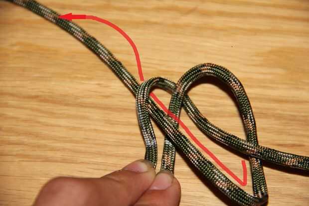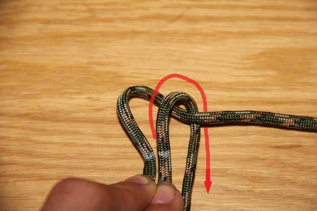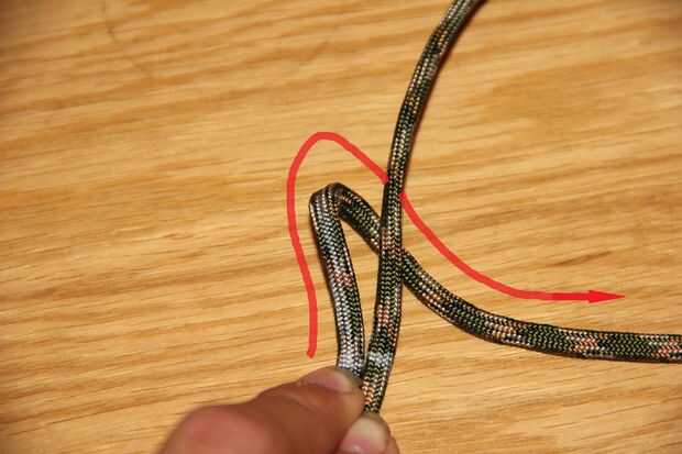 3. ahora pase la paracord derecho sobre sí mismo y a través del primer lazo hecho con la izquierda longitud del cable.