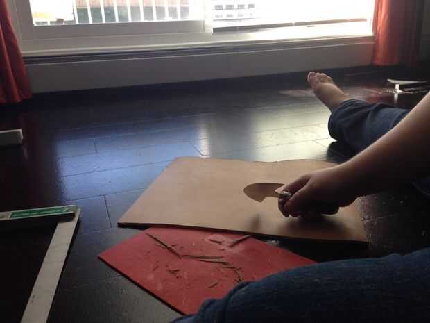 Escribir mi tablet encima de cuero en un lugar donde era feliz con la textura, sin fallas ni fisuras y coloca la pluma y el cable doblado donde yo quería que ser almacenados. Usando un cuadrado, remonta alrededor de mis artículos con una pluma, dejando sobre un centímetro (un poco menos de media pulgada para ti locos imperial) en el exterior. Asegúrese de que haces el trazo en el lado áspero de la piel, no su lado bueno. Luego usé mi cabeza cuchillo para cortar mi pieza. Los bordes no tienen que ser perfecto, como se puede limpiar más tarde. Asegúrese de que usted tiene algo para proteger su superficie, utilizar un viejo tablero de corte plástico.