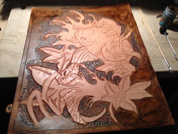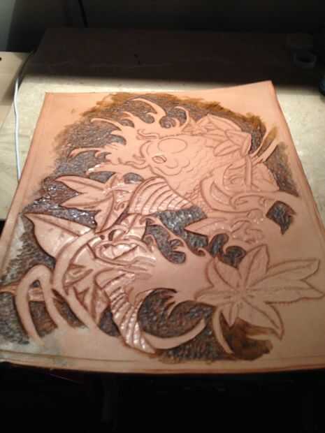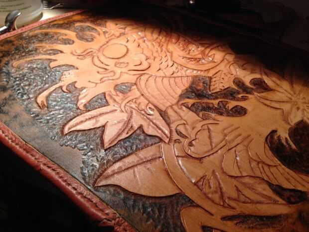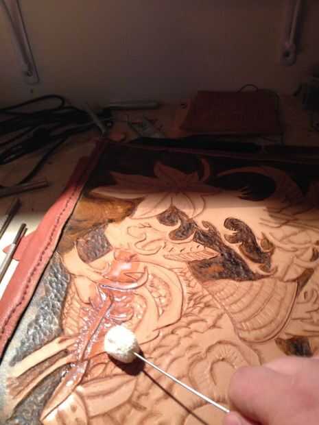 Puede utilizar a cualquier tipo de tinte de cuero en su proyecto. Tandy cuero tiene productos a base de agua, pero a base de alcohol trabajo de tintes muy bien también. Comencé utilizando un pincel para trabajar en los detalles de mi imagen, aprovechando los bordes biselados para obtener derecho a las líneas. Debido a la textura de fondo, no estaba preocupado acerca de trazos de pincel.
