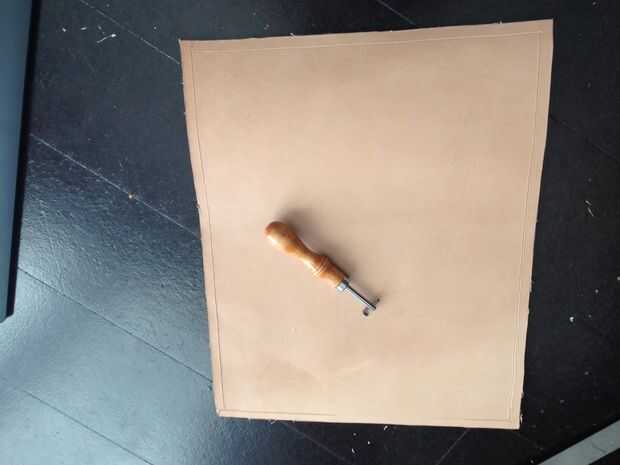 Grabó dos de los trozos juntos como traslapó en mi superficie de cuero fileteado. Luego usa un pequeño punzón para colocar en los agujeros de la costura y cosidas las dos piezas juntas. La tercera pieza fue dejada como es crear una aleta para el caso.
