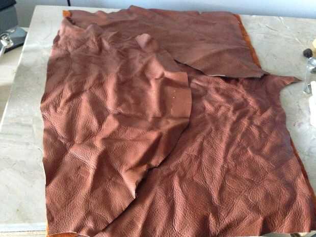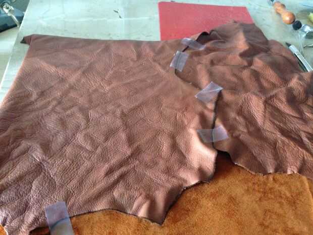 La caza mi montón de chatarra, encontré algunos hermosa piel sobrante que era capaz de organizar de una manera que cubre el panel completo de cuero fileteado, con suficiente solape para envolver alrededor hacia el otro lado. Porque yo trabajaba con chatarra, sólo arreglé las piezas para que ajuste y recortado a tamaño áspero, en lugar de cortar líneas bonitas o tener una pieza cubra toda la superficie (obviamente si usted tiene un gran suficiente pieza única hará su vida mucho más fácil).