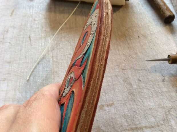 Usando un punzón de costura, 2 agujas y una longitud de la puntada de silla de montar hilo la vaina juntos. Me gusta usar un caballo cosido para sostener el proyecto para mí.