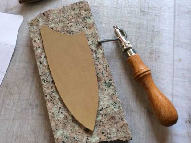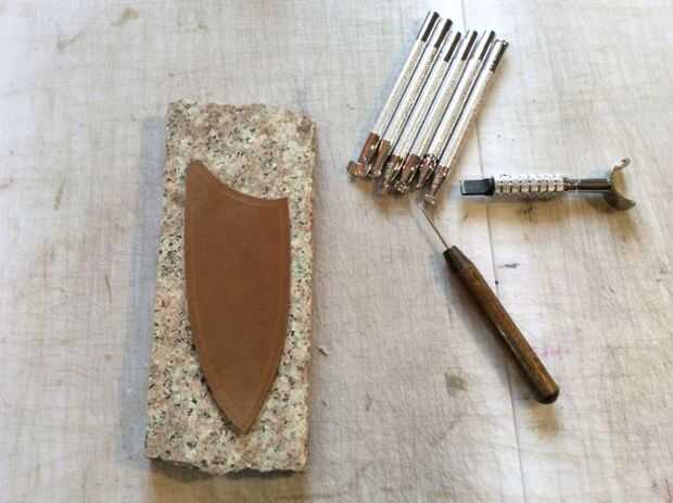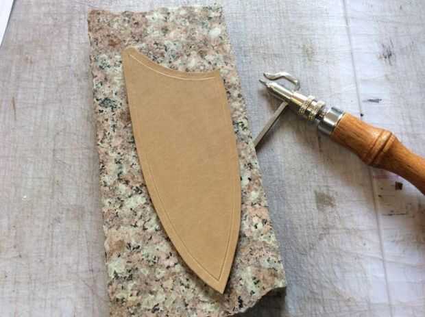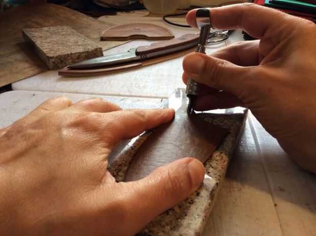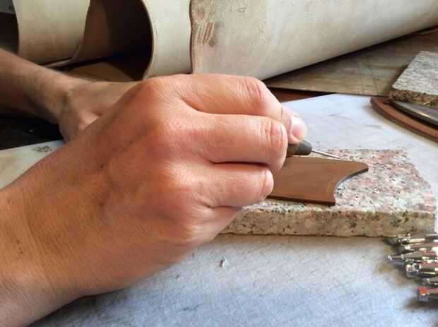 Luego use el cuchillo del eslabón giratorio para cortar las zonas que se desean estampar el más profundo. Corte en aproximadamente 1/3 del espesor de la piel. Desea mantener la cuchilla giratoria como se muestra en la foto 5 y asegúrese de que los lados de la lámina son perpendiculares a la superficie de corte. El filo es inclinado al cortar. Intente cortar con un movimiento suave sin parar.
