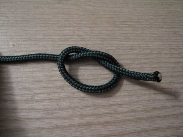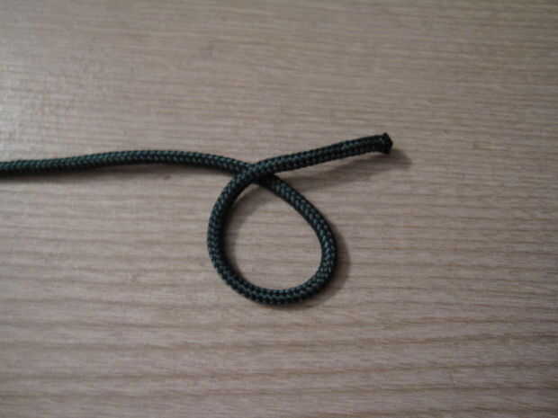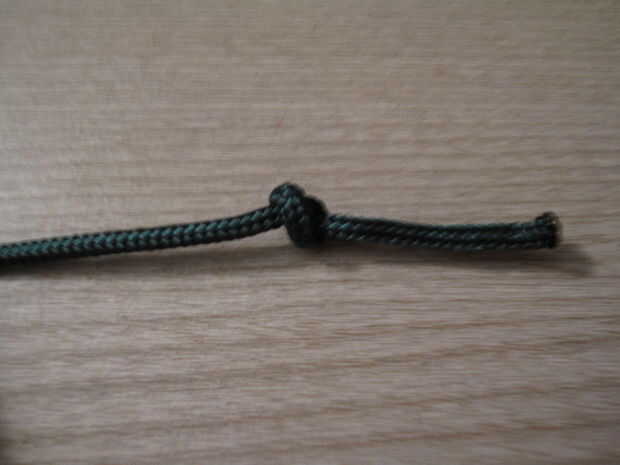 5) crear nudo de tope en un extremo del hilo de nylon. Usé un simple nudo. Es más que suficiente soportar el peso de la vaina y la lámina. Las imágenes se muestran cómo, o usted puede mirar aquí para más fotos y pasos en el nudo, u otros nudos más seguros como el sencillo doble o la figura 8. Tenga en cuenta que dejé un poco más al final, esto es intencional y es una buena PRECAUCIÓN. Si se corta a cerrar el nudo puede desentrañar. Podemos limpiar el final!