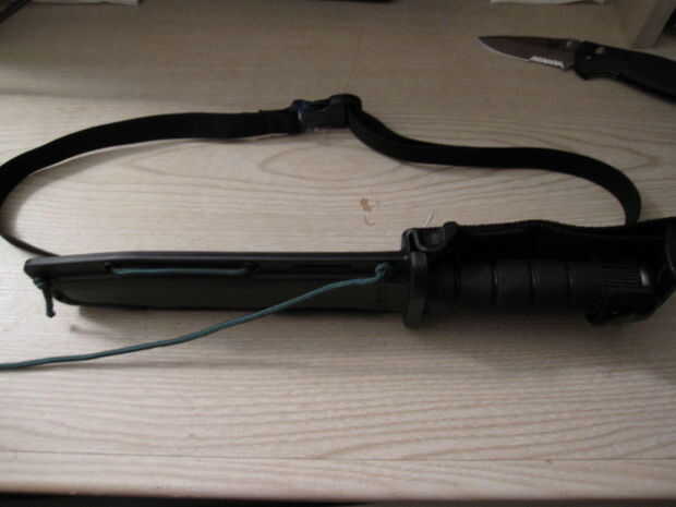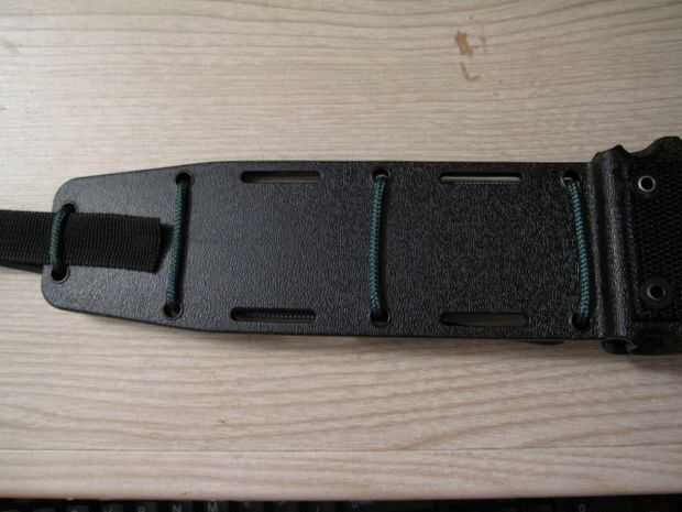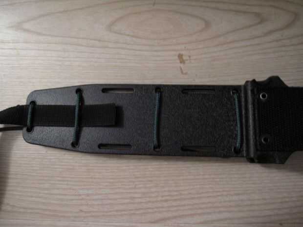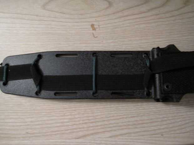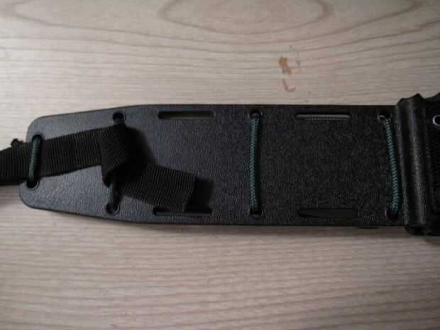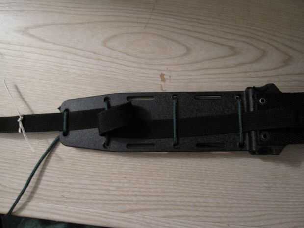 4) pase la correa alrededor del segundo bucle. Es necesario que pase la correa alrededor de dos lazos para inmovilizarlo y evitar que se deslice alrededor. Opté por la segunda y la cuarta y recomiendo que hagas el mismo, uno en cada extremo. Esto distribuir el peso del cuchillo y vaina uniformemente. No pude hacer el primer bucle, porque es demasiado pequeño para envolver. Primero pasan bajo el segundo bucle, luego envuélvalo alrededor y seguir adelante.
