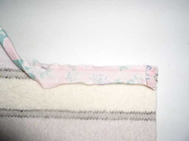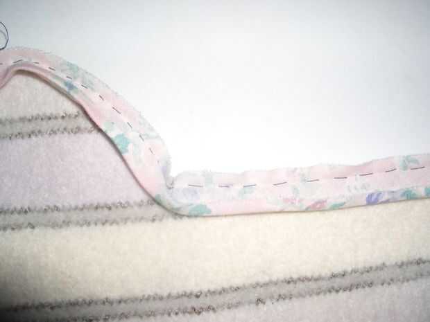 Por el grosor de la tela de fieltro, puede que necesite colocar el enlace con su borde ligeramente más allá del borde cortado de la cubierta. Después de que haya virado un par de pulgadas de enlace en su lugar, compruebe que se pliega perfectamente a encajonar el borde y reajuste si no. Puede ser, si utiliza ½" obligatorio, que este es el punto donde te das cuenta de que tendrá que ser más amplia, pero perseverar con estrecho enlace si se puede, parece más ordenado.