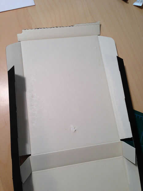 Desplegar el cuadro de Kindle y retire la ranura que se pega en el interior de la cubierta. Quieres ser un poco cuidado de no extraer demasiado de la cartulina apagado con el pegamento, pero no importa demasiado ya que se cubrirán al final. Luego, corte un rectángulo 4.5 de ancho por 6.5 de alto.