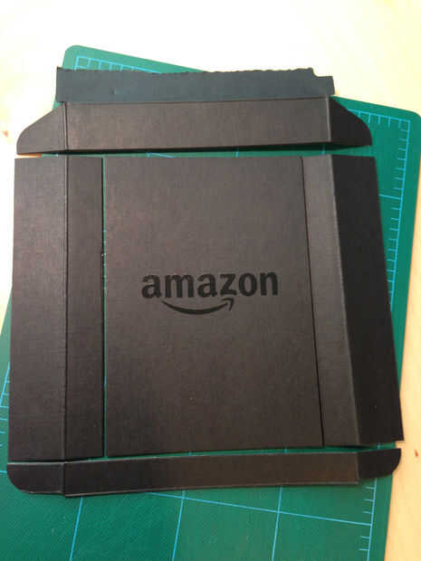 Corte otra pieza 4.5 de ancho por 6.5 de alto fuera de la caja. Puesto que esta pieza se cubre la parte exterior y mirar hacia fuera, decidí cortar una sección tal que el logo de "Amazon" barnizado se centró en el área. Obviamente no tiene que hacerlo, pero puede ser un buen toque.