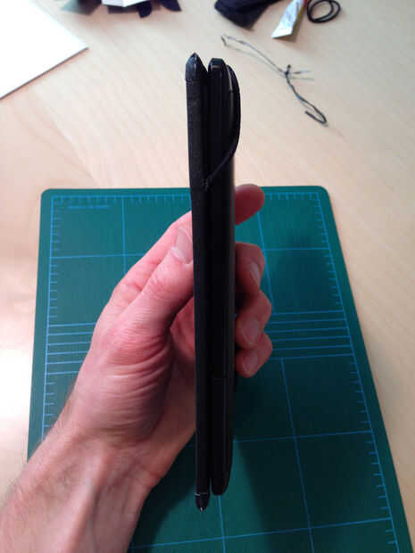 Aquí hay algunas fotos de la cubierta acabada. Calculo que añade sobre un 60% para el espesor del Kindle pero nada a la anchura y la altura. Cuando estoy utilizando el Kindle, vuelva a colocar la caja en la parte posterior y las correas deben ser sobre las esquinas de la pantalla.