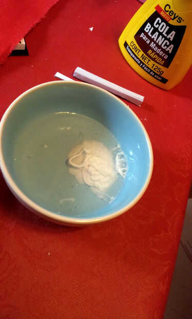 Con cola blanca y con poco de agua, yo no la diluido del todo, simplemente el agua me ayudaba a extenderla, hay impregnar todo el interior del papel, el hueco hemos cortado.