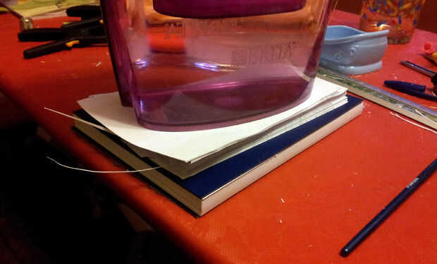 Tras la primera capa es importante poner algo de peso para que no se arqueen todas las hojas, por el efecto de la humedad de la cola + agua.
