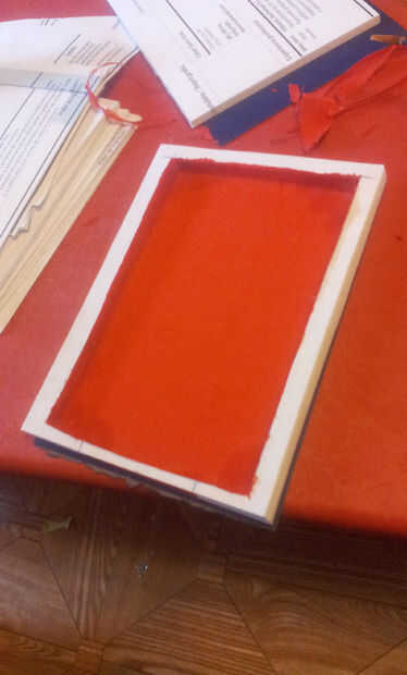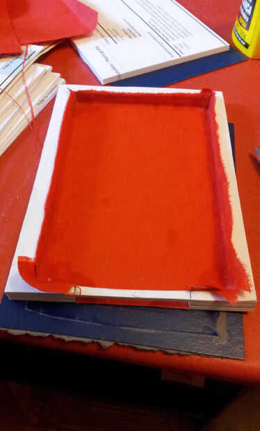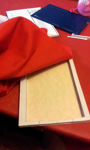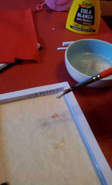 Impregnad todo el fondo y los cantos de cola aguada y pegáis la tela, alisándola con los dedos.
