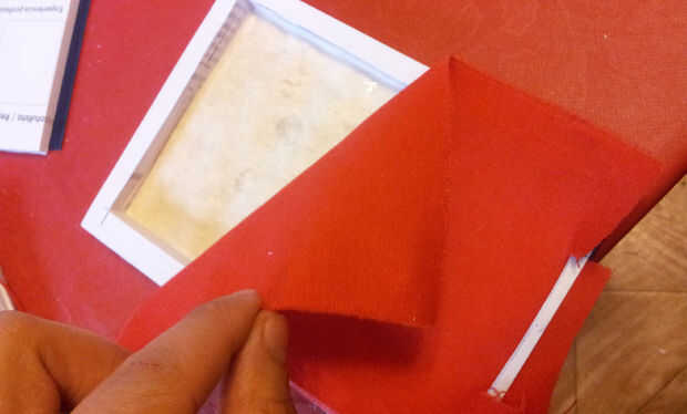 Buscamos una tela de nuestro gusto, y metemos el lector, aprisionando la tela en el hueco del papel. Tiene sobrar un poquito por todo el perímetro.