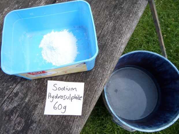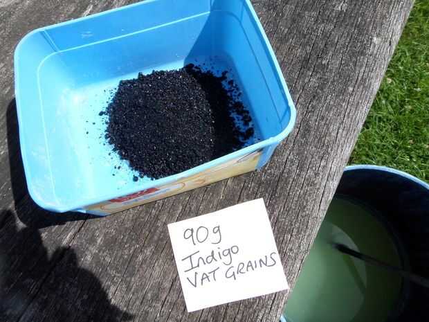 Estoy usando añil IVA granos e hidrosulfito de sodio (o podría usar Spectralite, que es lo mismo, más caro) también soda cáustica y sal. (Kemtex suministros educativos...), es una buena fuente para el hidrosulfito de sodio el añil y el si vive en el Reino Unido.