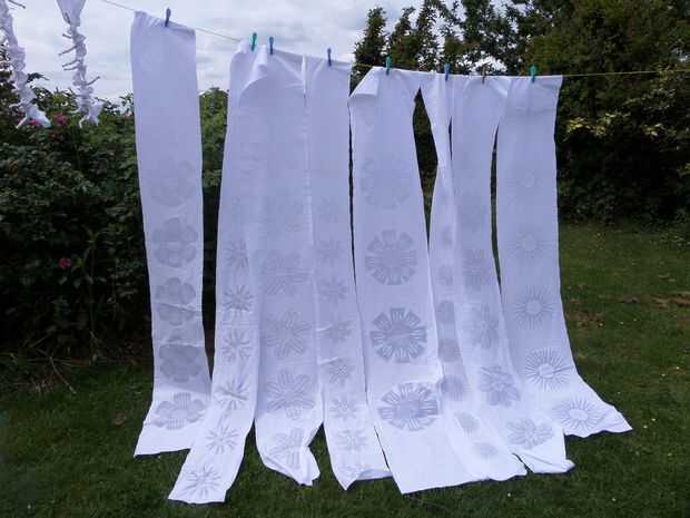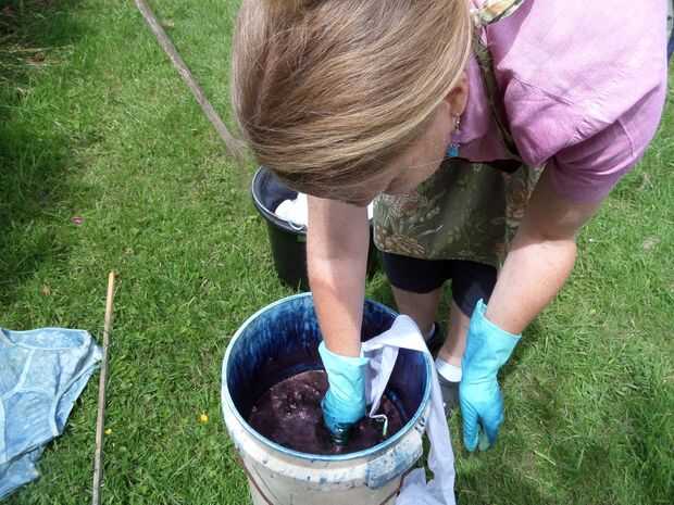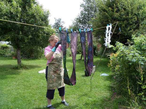 Tienen todos su tendedero, clavijas y cubo de agua para humectación listo, a continuación, pasar cada trozo de tela a través de la agua fría antes de teñir ya que abren las fibras y la tela tomar el tinte más fácilmente